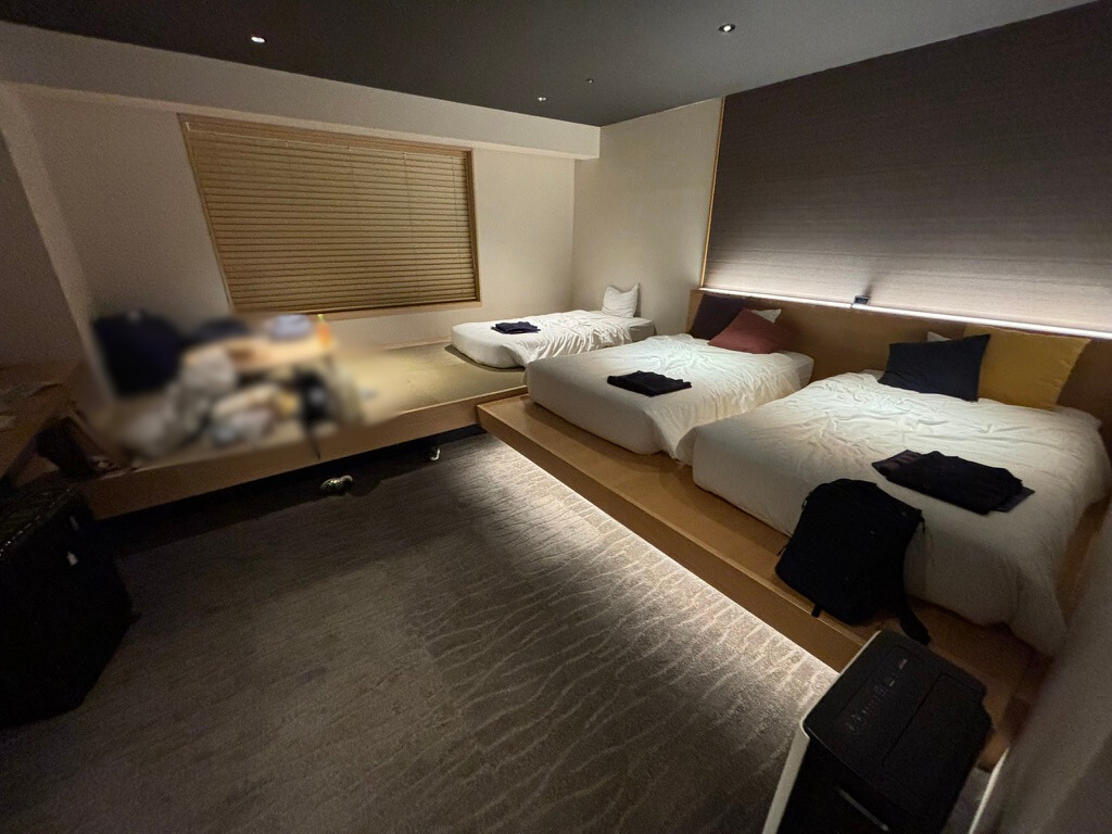 ▼高さの抑えられた和ベッド?が3つ並んだトリプルの部屋。奥には座敷もあって広々〜。