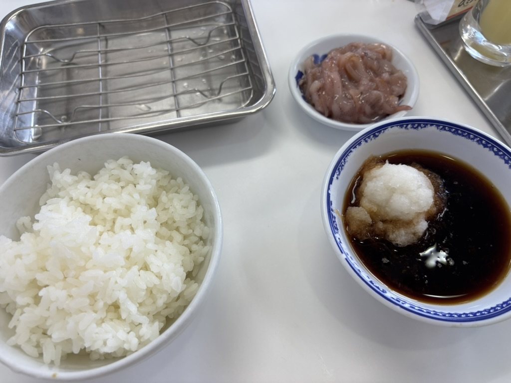 ▼定食を頼むとイカの塩辛(右上)もついてくる。出されたバット(左上)に、揚がった順で天ぷらがどんどん出てくる。(食べることに夢中になってしまったため、天ぷらが並んだ所を写真に撮りそこねてしまった💦)