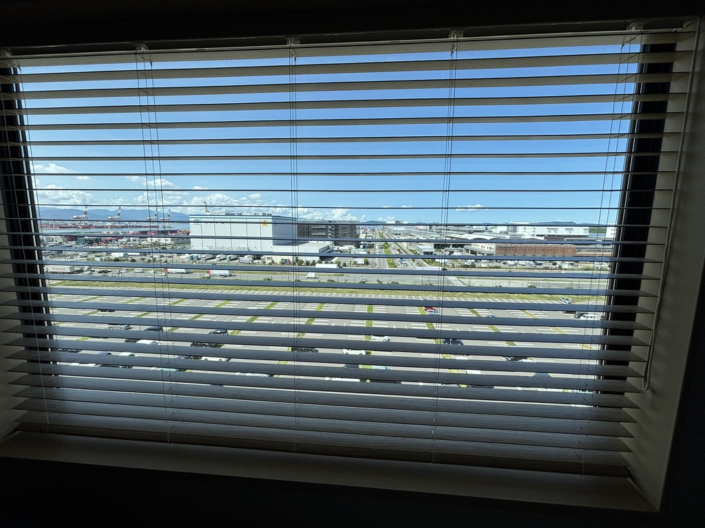 ▼お部屋のブラインドの向こうも、お風呂と同じく港が見える(これは翌朝の眺め)。眺め広々で気持ちいい〜。