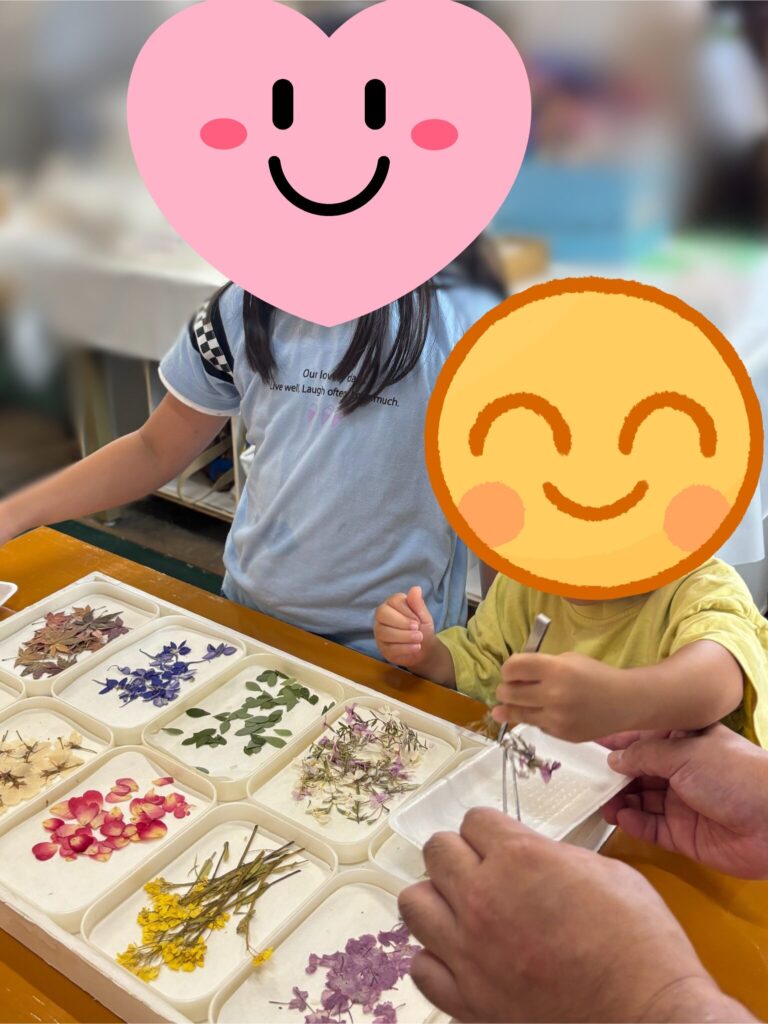 ▼スタッフさんに手伝ってもらいながらがんばる娘氏。押し花も数種類用意してくれているので、梳いた後はそれを乗せて飾り付け。
