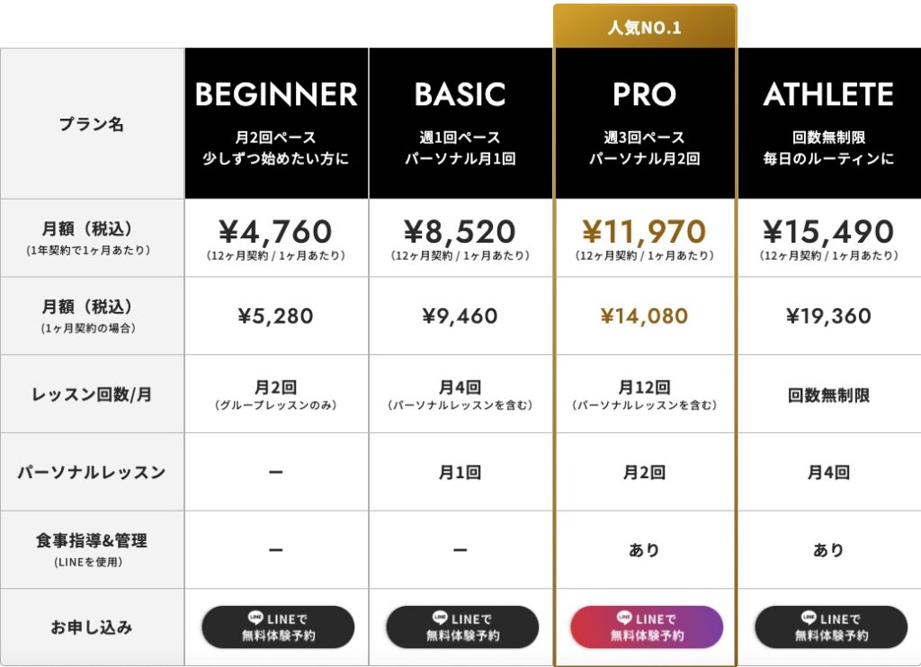ということで、プロコースを選びました。(コースの違いは、受講できる回数や、パーソナルや食事指導の有無の違いだけなので、初心者だからビギナープランが良いというわけではない)