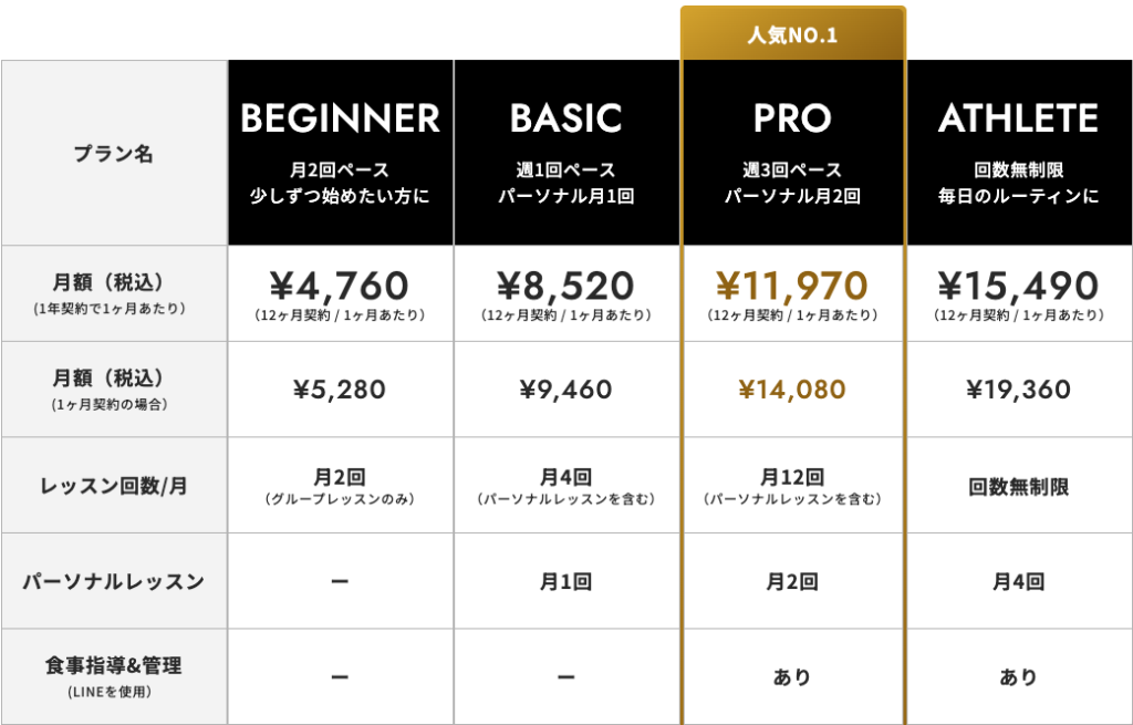 私は「プロ」プランを受けています。4つのプランはトレーニングのハードさで分かれているのではなく、月何回クラスを受けられるか等で分かれています。